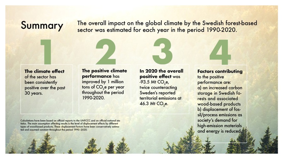 The climate benefit of the Swedish forest-based industry has increased by 46 percent over the past 30 years. This has made a strong contribution to reducing Sweden’s total carbon emissions, while also benefitting other European countries, where about 65 percent of all Swedish forest-based products are consumed. The Swedish Forest Industries’ new report, The Climate Impact by the Swedish Forest-based Sector 1990-2020, also shows that the industry annually creates a climate benefit that is twice as large as the entire country’s carbon emissions.
