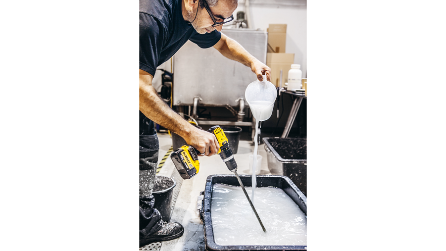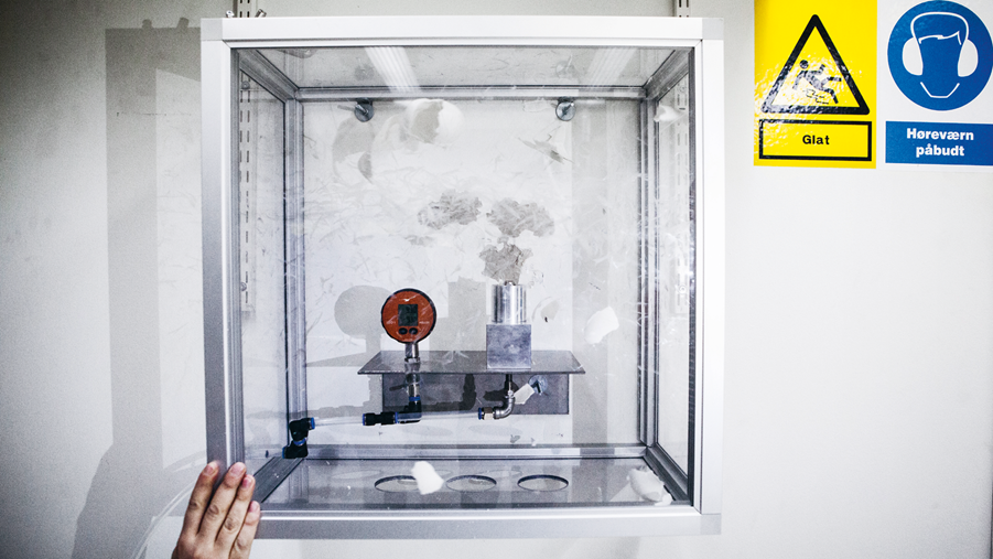 "When I close the hatch, an alarm will ring so that everyone will know what's going to happen – right after that, I'll blow the bottle. Do you have your hearing protection on?" The technician closes the cover of the small plexiglass box where he put the white paper bottle. The alarm sounds through walls and ceilings to the office above and to the production rooms next to it, before it reaches a pitch so high that everyone jumps.